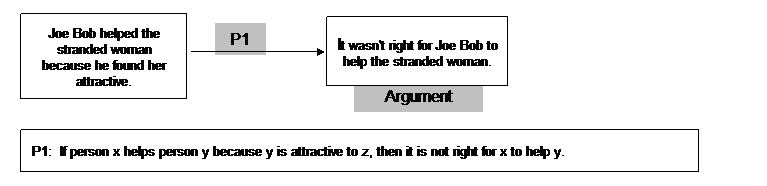 P1 is another ad hominem facilitating principle that contains a little bit of truth but remains highly unreliable. Most of us would say that helping the woman was the right thing to do regardless of Joe Bob's motives. Of course, the fact that Joe Bob was attracted to the woman isn't what makes his action right. We might agree with Maureen that Joe Bob isn't particularly admirable for having done it, and that it would be really disgusting if he just drove right by a homely woman in the same situation, but these are different points.