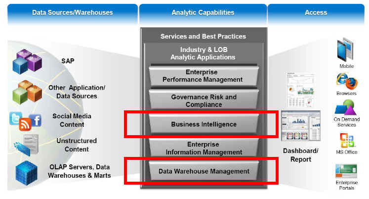 The purpose of the homework assignment is to encourage further practice of the theoretical topics covered in our book. The image below shows you the 3 major components of SAP's Business Intelligence architecture: Sources, Capabilities, and Access (think of it as Input, Process, Output).