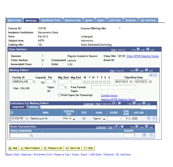 - The first meeting pattern Facility ID is WEBONLINE. The days are set to Thursdays from 8/30/2010 to 12/10/2010 for the entire term.