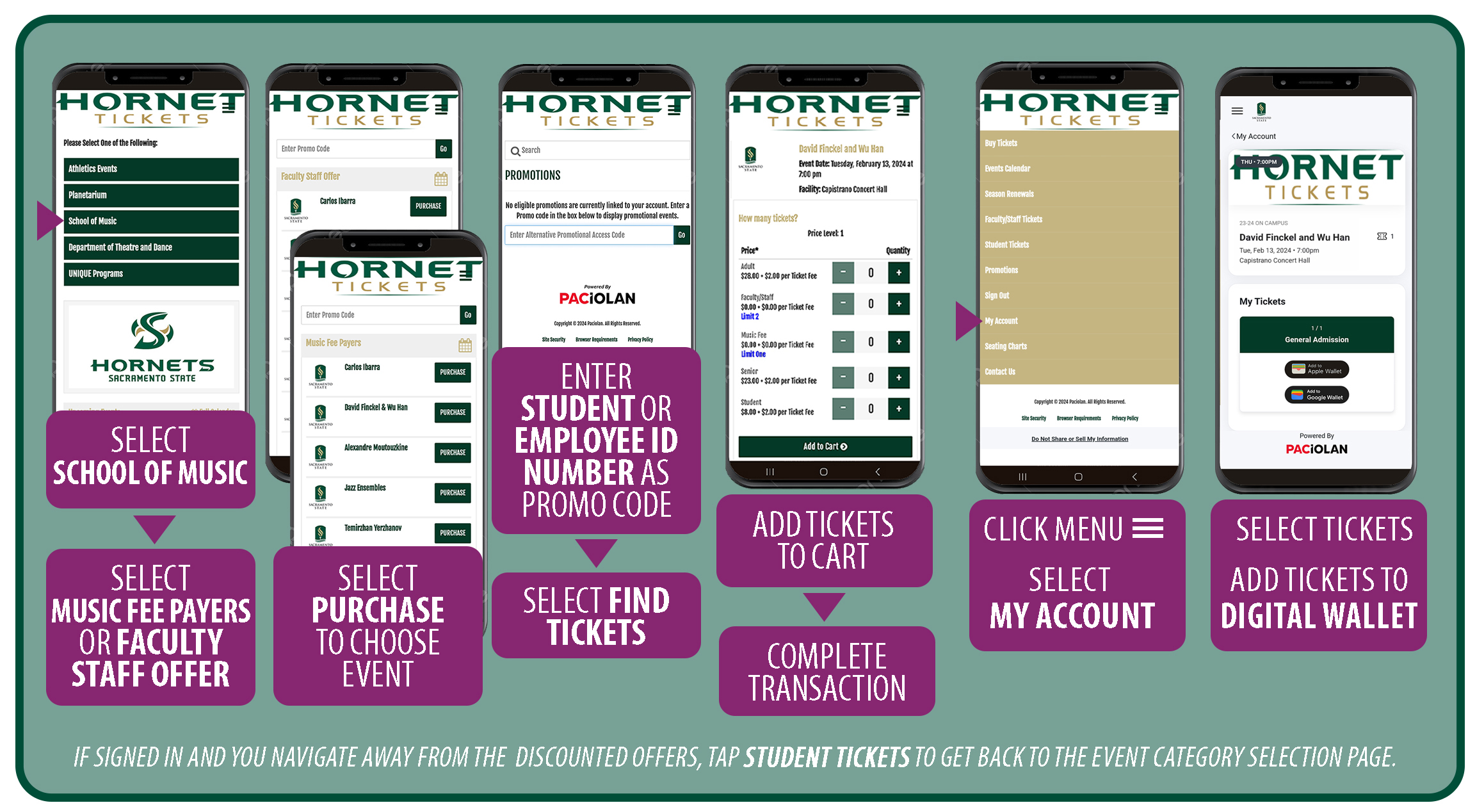Music Staff & Student Fee Payers, your free ticket offers are available by using your "My Sac State" login credentials (single sign-on) and adding your Student or Employee ID number as the promo code when asked.