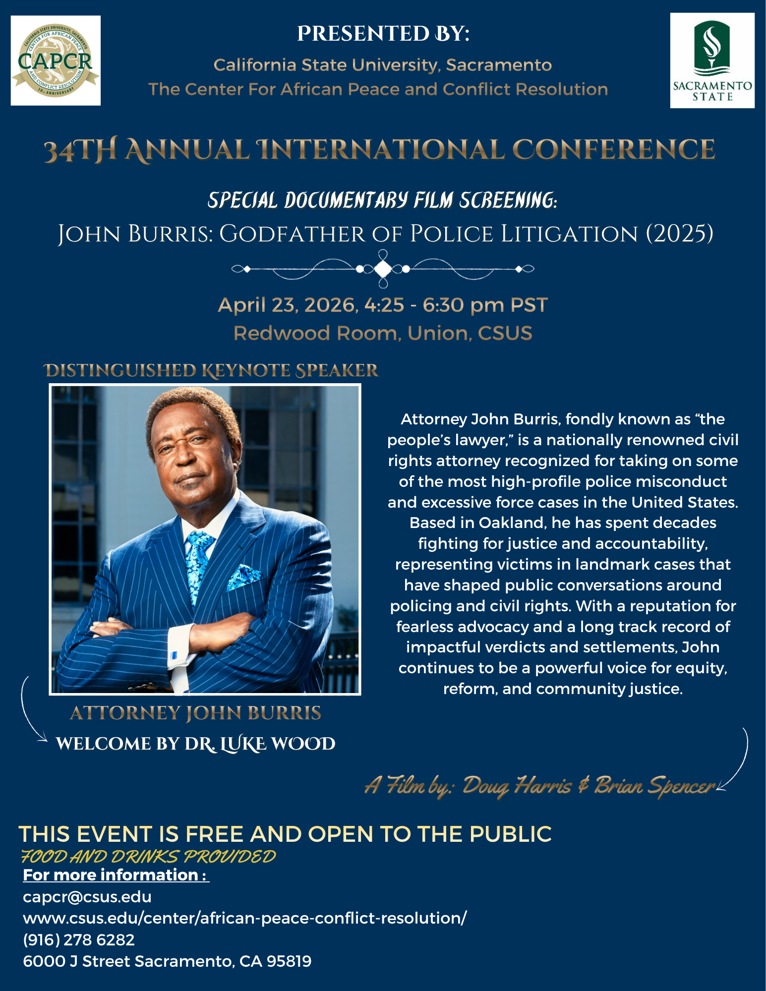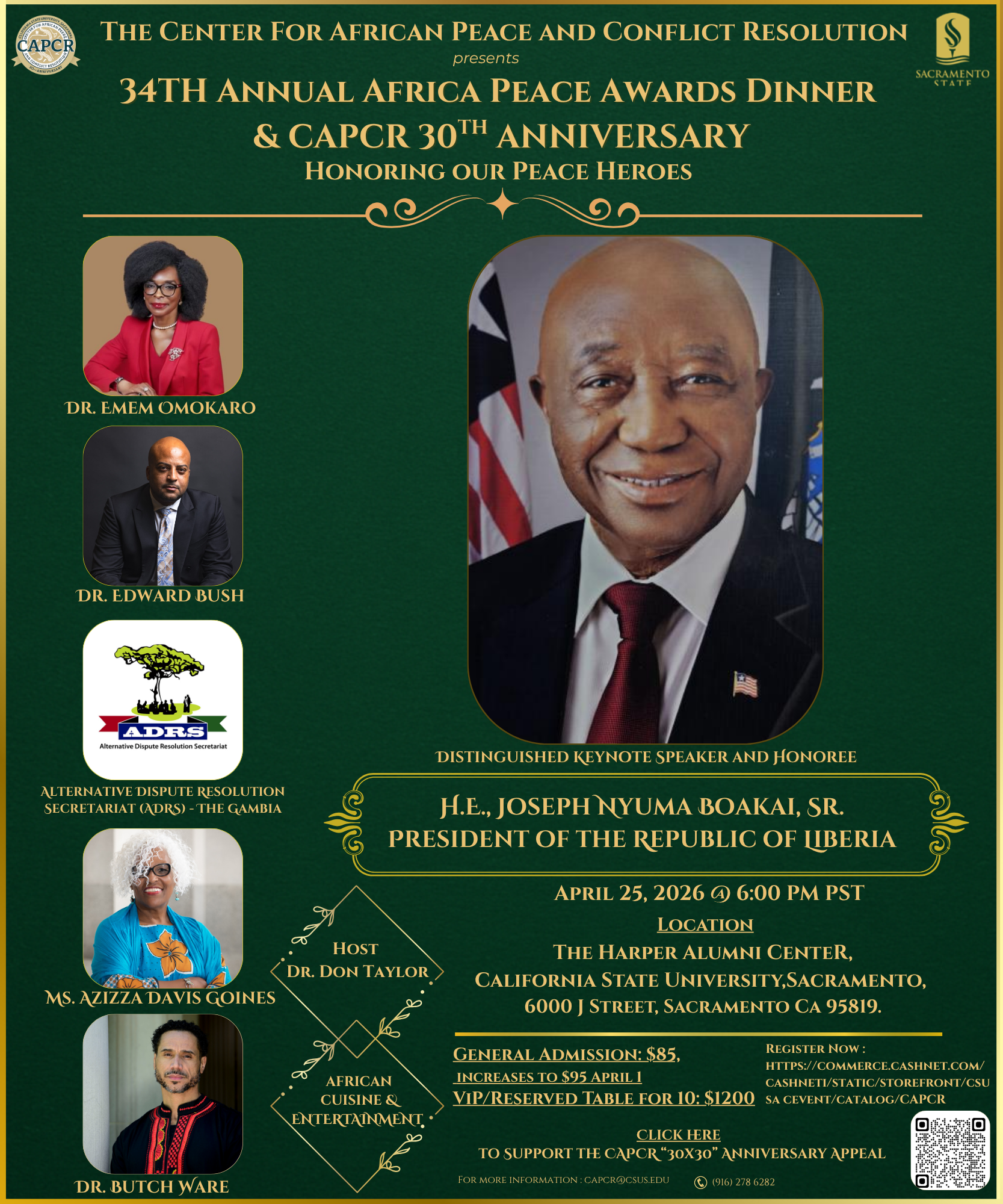 The Center for African Peace and Conflict Resolution (CAPCR) was established in 1996 at California State University, Sacramento, to provide conflict resolution and reconciliation services for agencies, governments, institutions, businesses, civil society and community organizations and other groups through training, education, research, and intervention.Donate: CAPCR