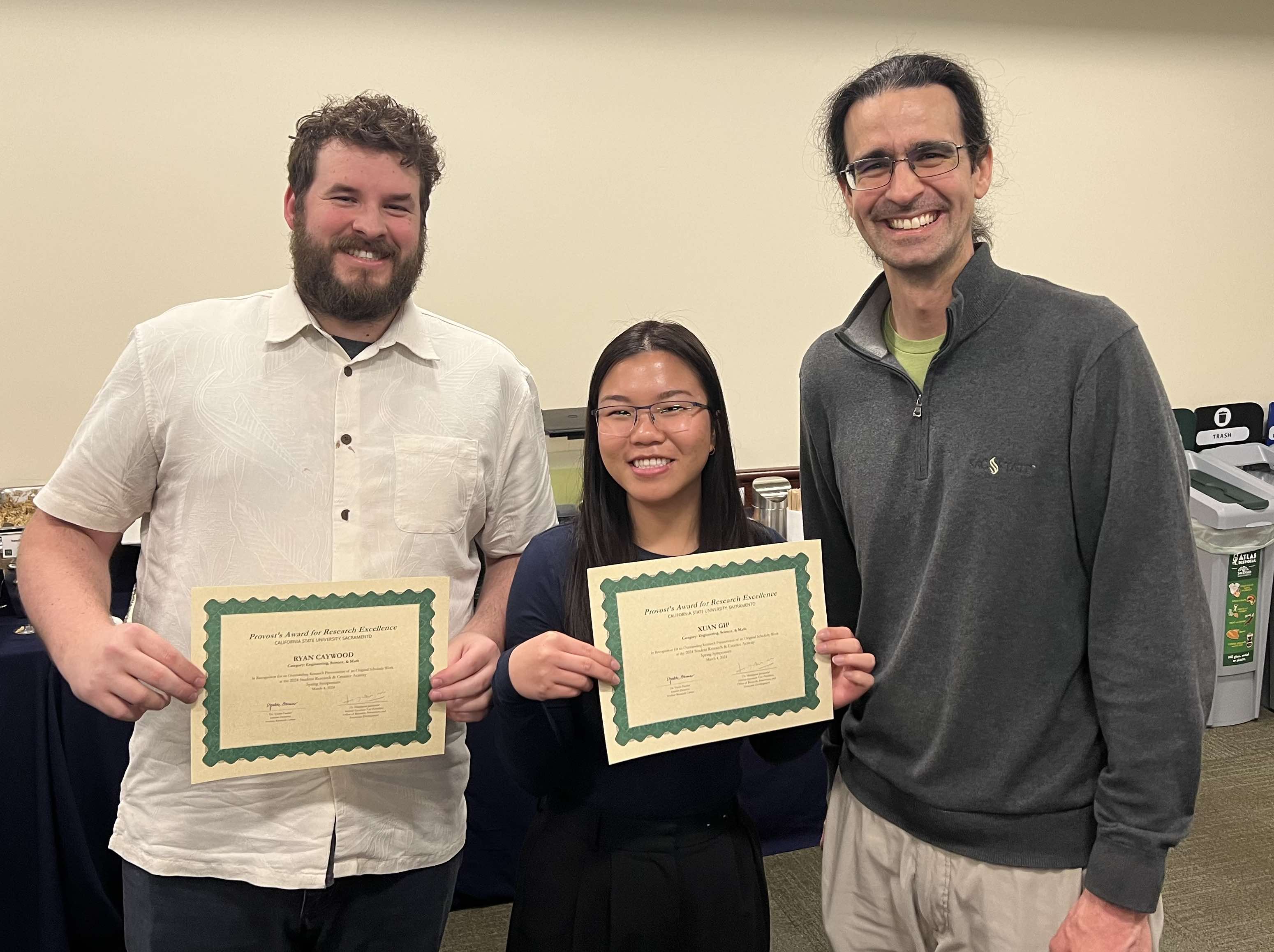 Three outstanding student researchers received awards for their presentations on their work at the Sacramento State Student Research and Creative Activity Symposium on March 4, 2024. Justin Vian-Reagan presented a talk on his work with Dr. Michael Ray on “Measuring the Linear Thermal Contraction of Polylactic Acid.” Ryan Caywood presented a talk titled “From Black Hole to Afterglow,” based on his work with Dr. Rodolfo Barniol Duran, and Carly Gip, also working with Dr. Barniol, spoke about her research on “Using Monte Carlo Simulations to Analyze the Striped Jet Model.” All three received first or second place in their session, and were awarded with the Provost's Award for Research Excellence.