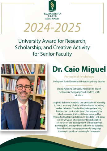 Professor of Psychology, Dr. Caio Miguel, has been recognized for his research in using Applied Behavior Analysis to teach generative language to children with autism. Dr. Miguel is the recipient of the 2024-2025 University Award for Research, Scholarship, and Creative Activity for Senior Faculty.