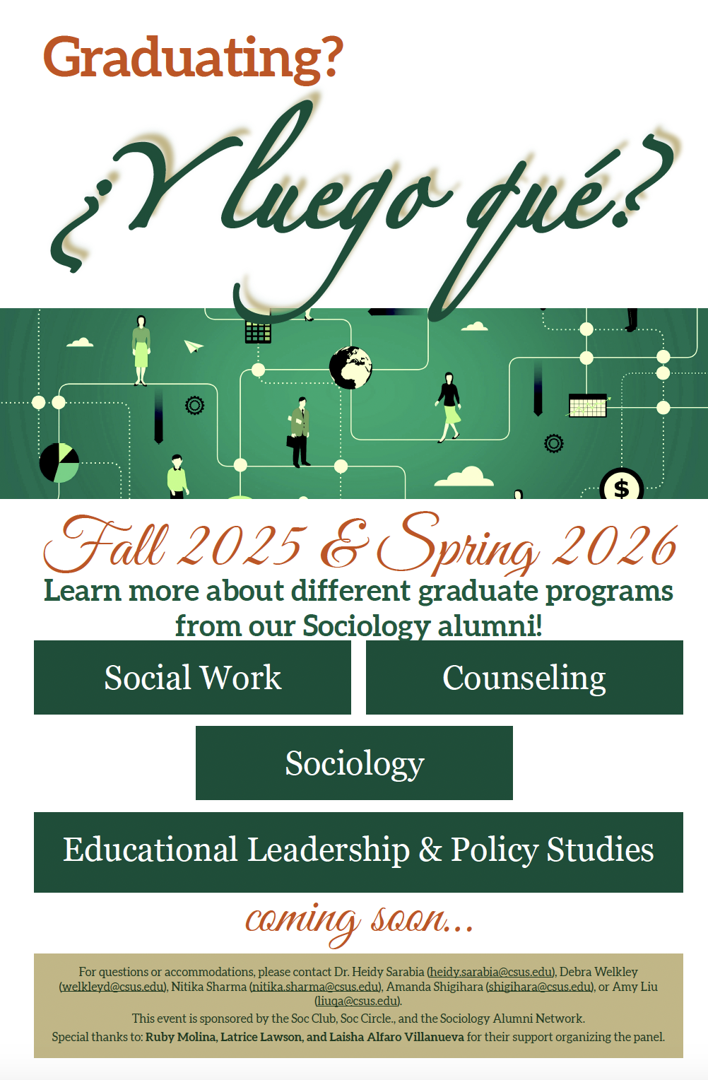 Webinar with Dr. Gonzalez and Dr. Shigihara discussed the process of considering and applying for a graduate program, in general and in Sociology at Sac State. View Dr. Gonzalez' Powerpoint presentation here.