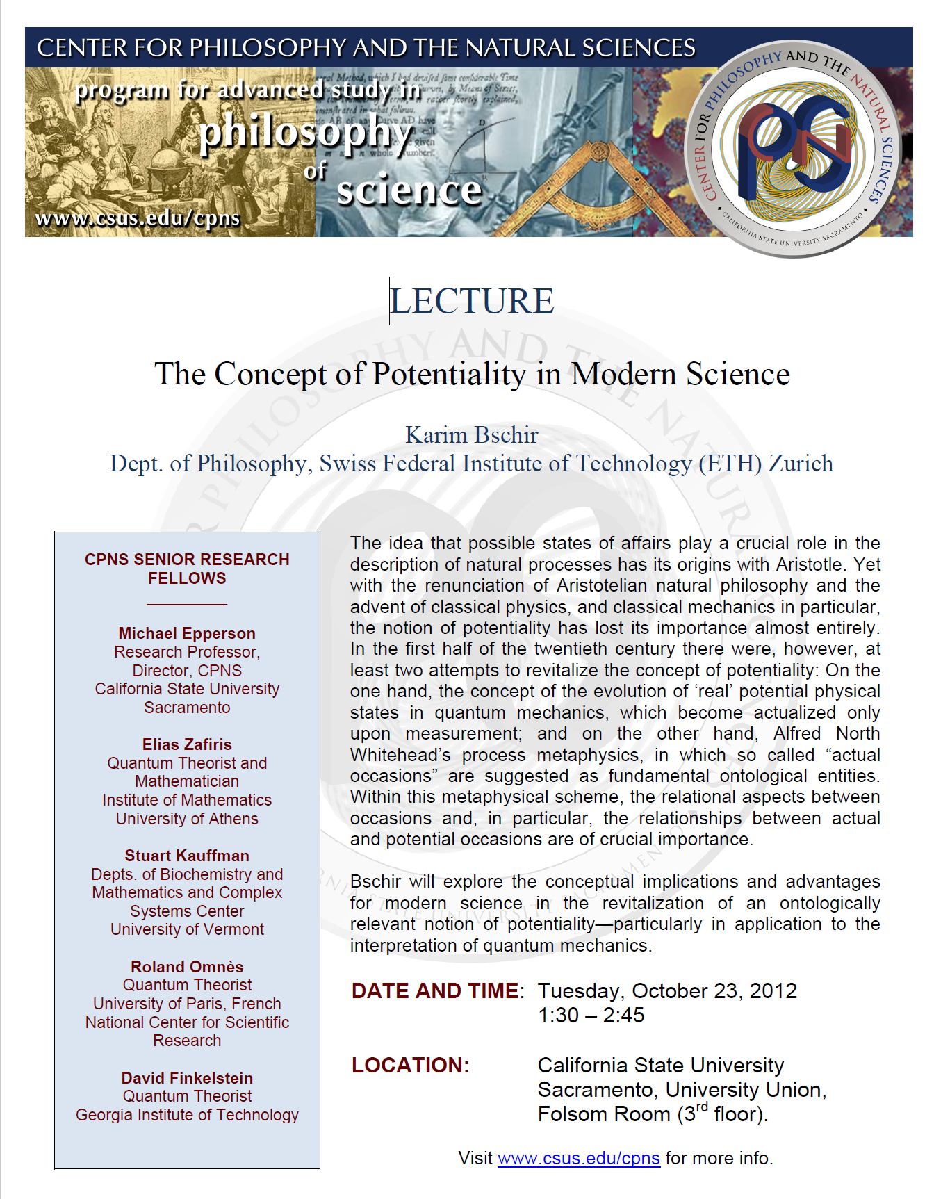 CPNS Visiting Scholar Lecture - Karim Bschir, ETH Zurich - “Potentiality in Natural Philosophy” - 1:30-2:45, University Union, Folsom Room (3rd Floor)