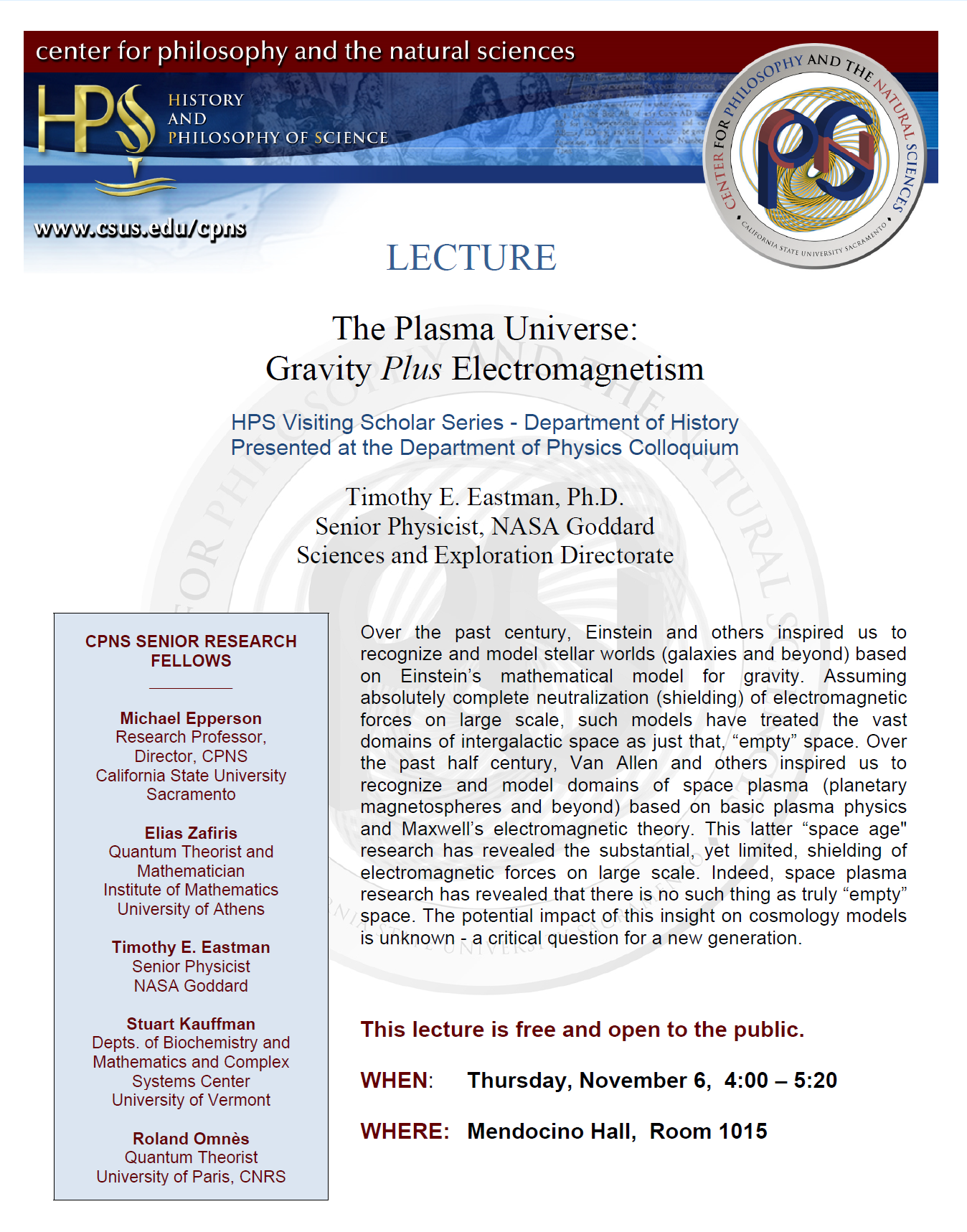 The CSUS Department of Physics Colloquium invited CPNS Senior Research Fellow, NASA Goddard physicist Tim Eastman to present a lecture to students on "The Plasma Universe: Gravity Plus Electromagnetism."