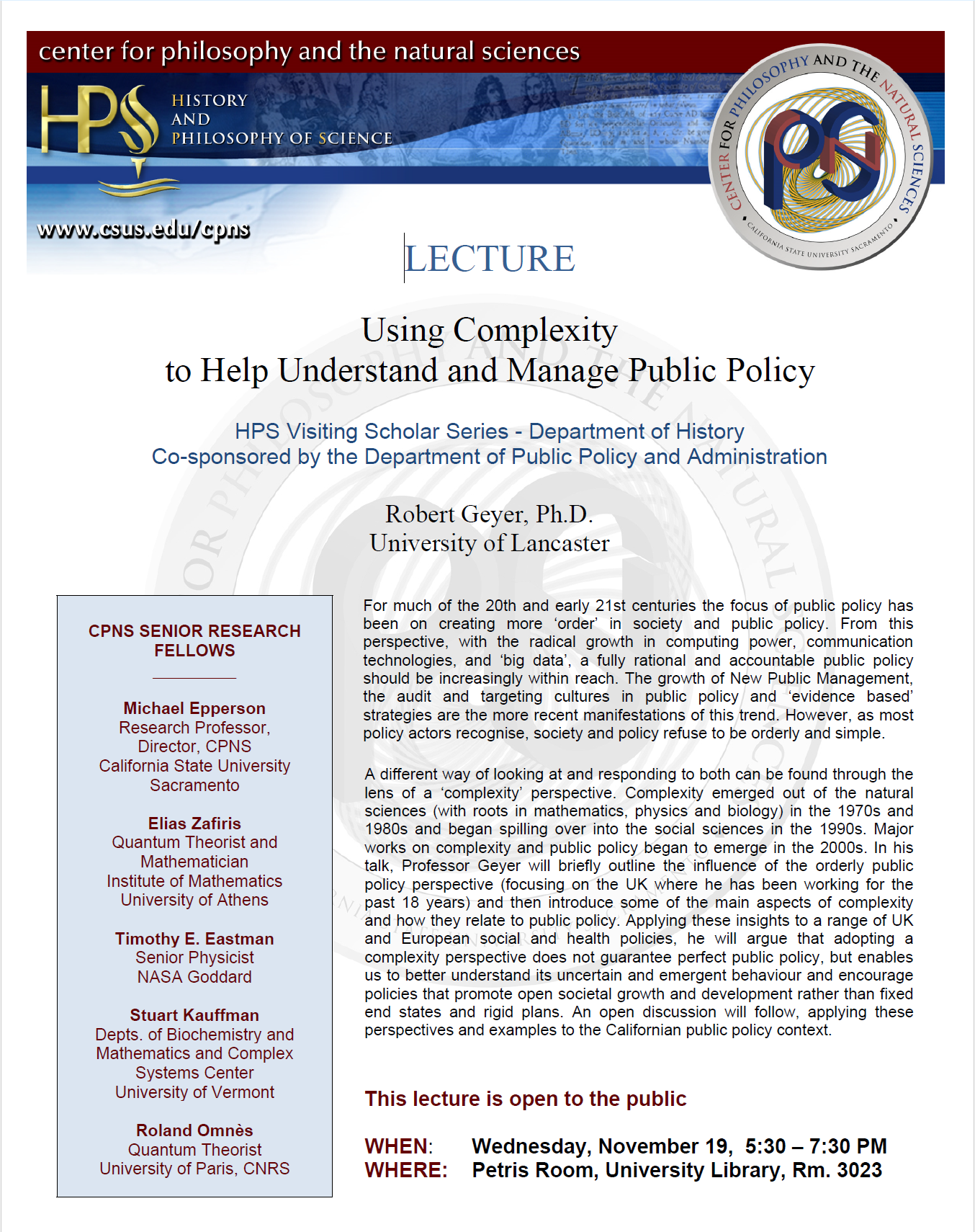 CPNS Visiting Scholar Lecture - Dr. Robert Geyer, University of Lancaster - "Using Complexity to Help Understand and Manage Public Policy" - Co-sponsored by the CSUS Department of Public Policy and Administration - 5:30 - 7:30 pm Petris Room, University Library (3rd Floor, Room 3023)