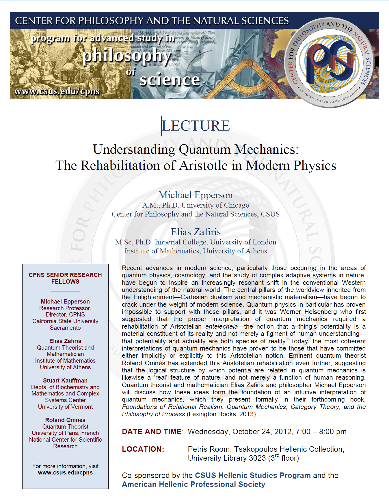 CPNS Public Lecture: Michael Epperson and Elias Zafiris: “Understanding Quantum Mechanics: The Rehabilitation of Aristotle in Modern Physics” - Co-sponsored by the Hellenic Studies Program and The Hellenic American Professional Society - 7:00-8:00 pm, Petris Room, University Library 3023 (3rd floor)