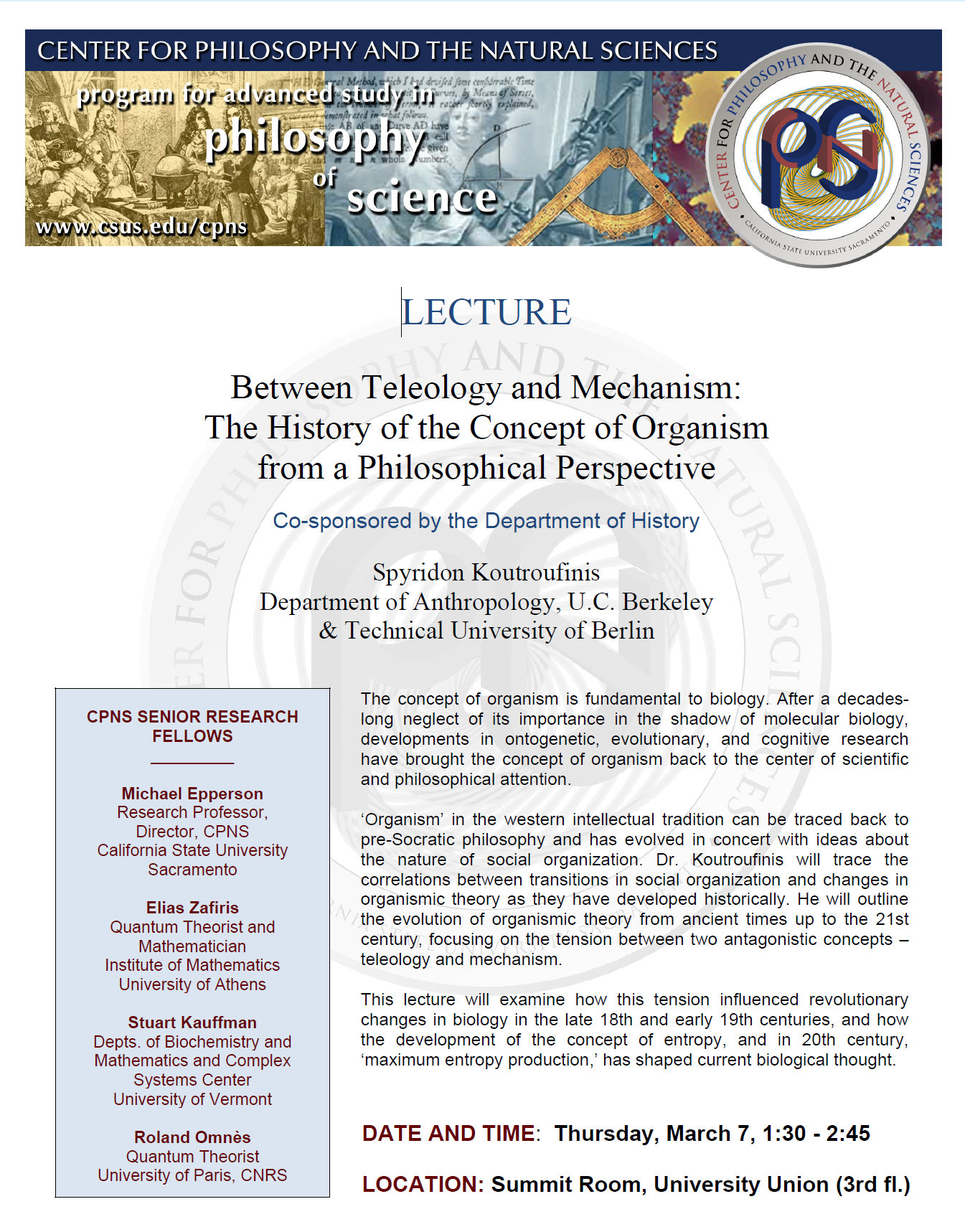 CPNS Visiting Scholar Lecture - Spyridon Koutroufinis, Technical University of Berlin & Visiting Professor Department of Anthropology U.C. Berkeley - “Between Teleology and Mechanism: The History of the Concept of Organism from a Philosophical Perspective” 1:30 - 2:45, Summit Room, University Union, 3rd Floor - Co-sponsored by the Department of History