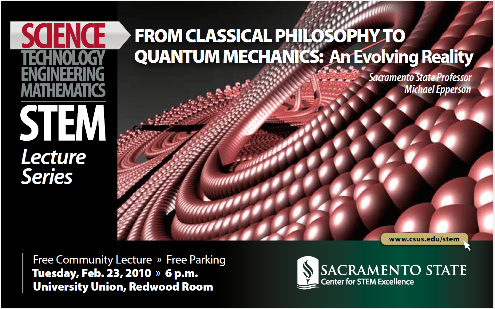 Invited Lecture by Michael Epperson, "From Classical Philosophy to Quantum Mechanics: An Evolving Reality" California State University, Sacramento University Union