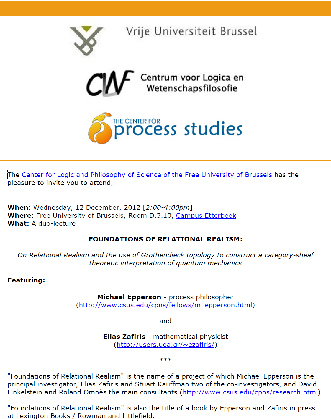 Duo Lecture, Michael Epperson and Elias Zafiris: “Foundations of Relational Realism: On Relational Realism and the use of Grothendieck topology to construct a category-sheaf theoretic interpretation of quantum mechanics”