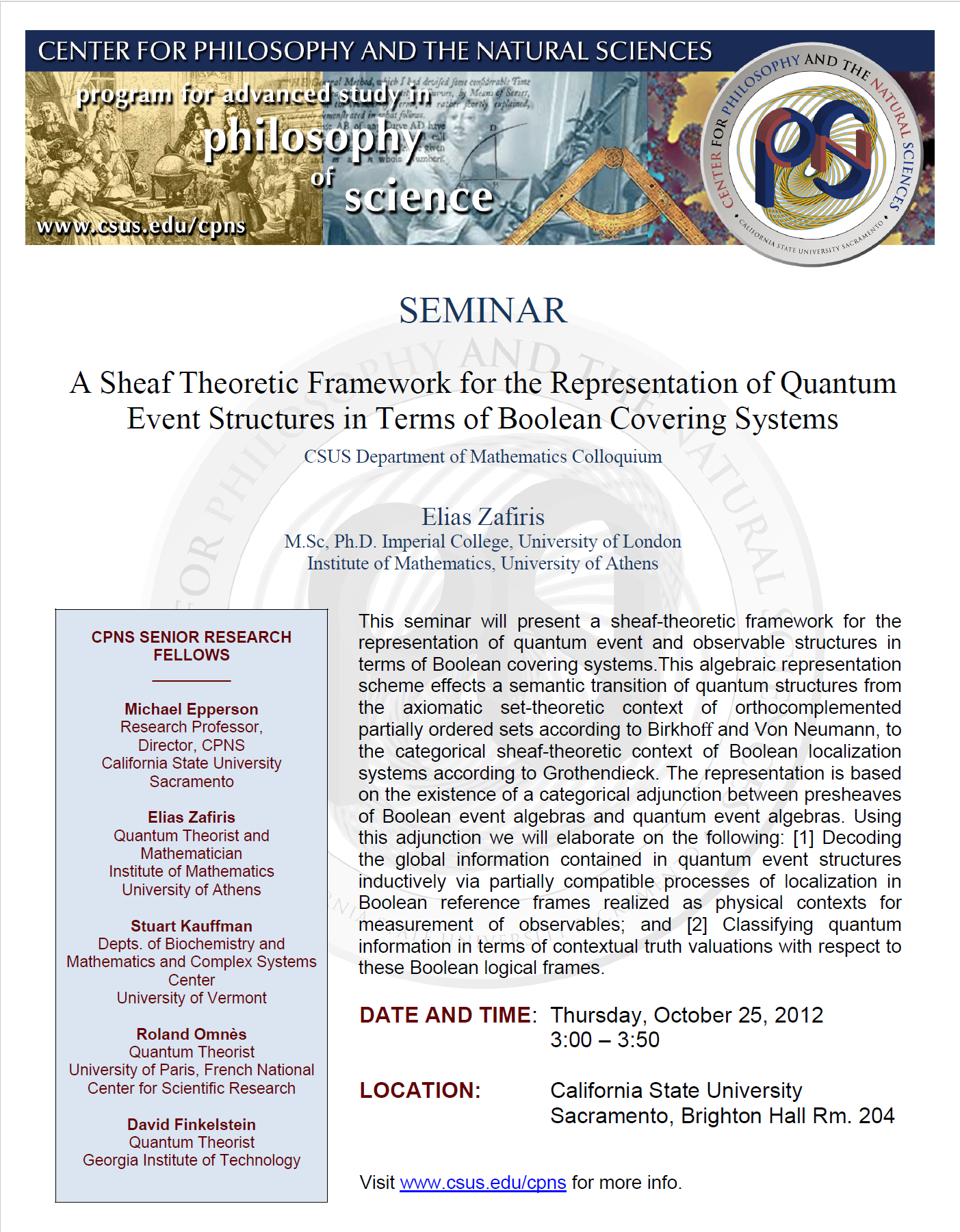 CPNS Seminar: Elias Zafiris, University of Athens, Institute of Mathematics - “A Sheaf Theoretic Framework for the Representation of Quantum Event Structures in Terms of Boolean Covering Systems” - 3:00-3:50, Brighton Hall, Rm. 204