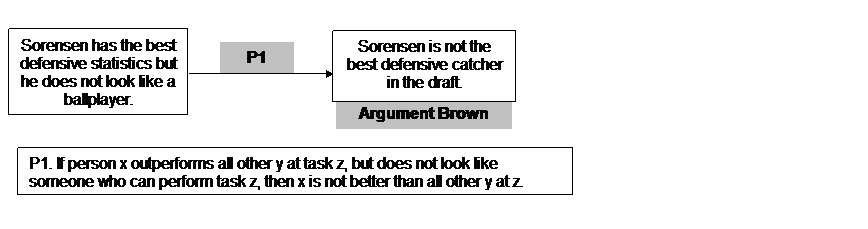 This principle is intelligible, but in the end, it does not seem particularly charitable to attribute it to Brown. So we conclude that what he is saying is not really relevant to the issue whether or not Sorensen is the best defensive catcher, but rather some other issue, like whether or not Sorensen's defensive numbers predict that he will perform well at a higher level.