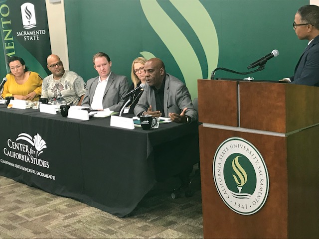 Panelists discuss issues relative to how tax revenue from recreational cannabis sales can benefit communities hurt by the old federal government "war on drugs." (Sacramento State/Cynthia Hubert)