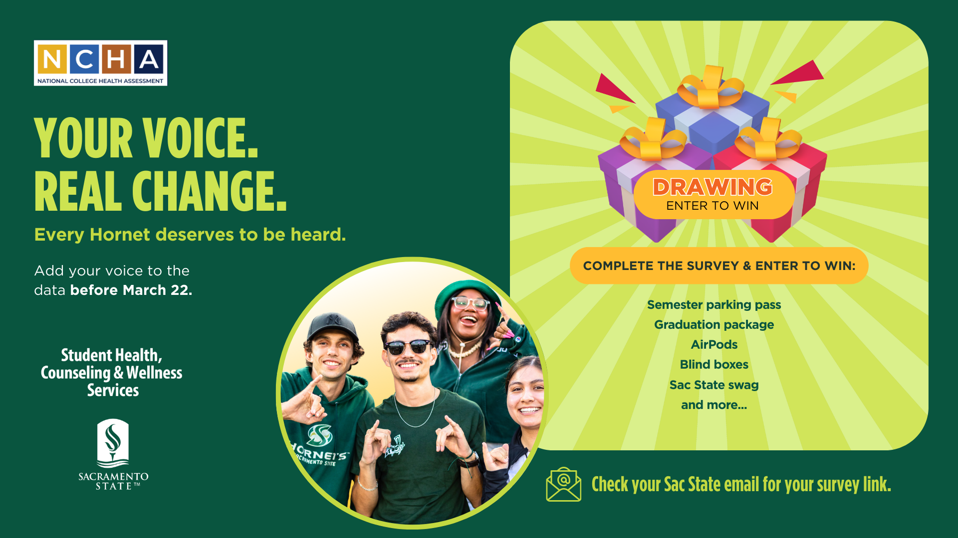 - Look for the email you received on March 2 with the subject line: “Calling all Hornets: add your voice to the 2026 NCHA Survey”