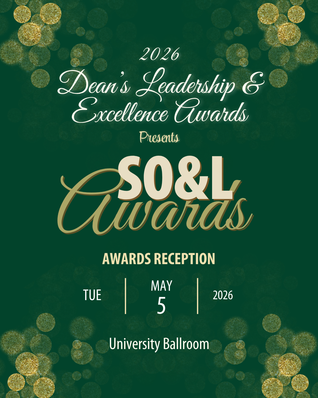 All recipients of the SO&L Awards will be notified via email of their selection and will be recognized at the 2026 Dean's Leadership & Excellence Awards Reception.